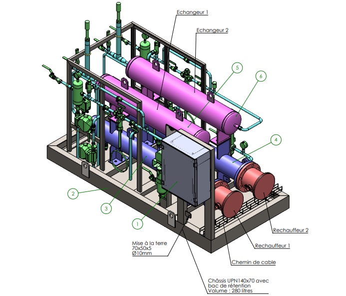 The viscosity of heavy fuel oil requires preheating via a reheating skid (below).